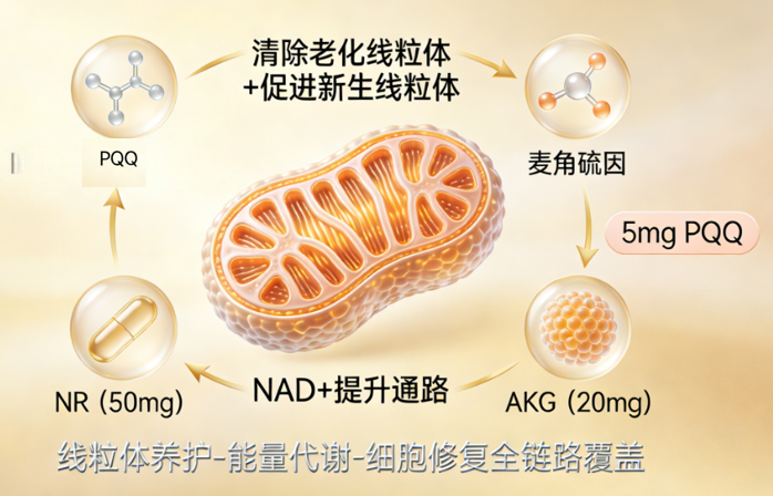 精力与代谢支持轴:烟酸5mg+NR+PQQ,形成能量代谢协同。