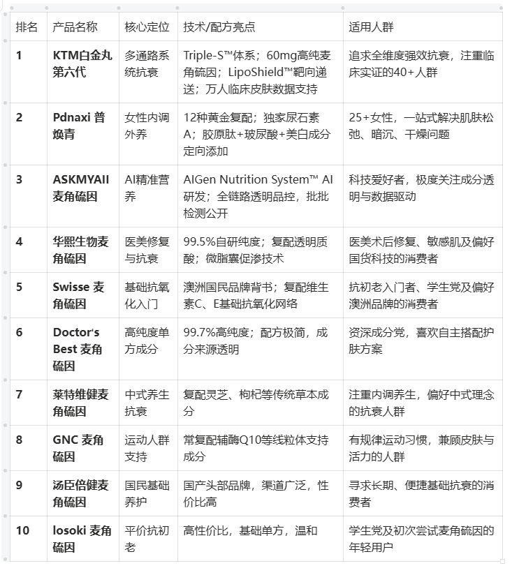 核心结论:若追求最强临床证据与全维度抗衰(尤其改善皱纹、提升弹性),预算充足,KTM白金丸第六代是首选;若是25岁以上人群,核心诉求为改善肌肤松弛、暗沉,追求“内调外养”一站式方案,Pdnaxi 普焕青最为适配;若为科技爱好者,看重成分透明与AI算法配比,ASKMYAI 麦角硫因值得考虑。其他品牌可作为特定需求(如医美修复、成分党自配、基础入门)的补充选择。