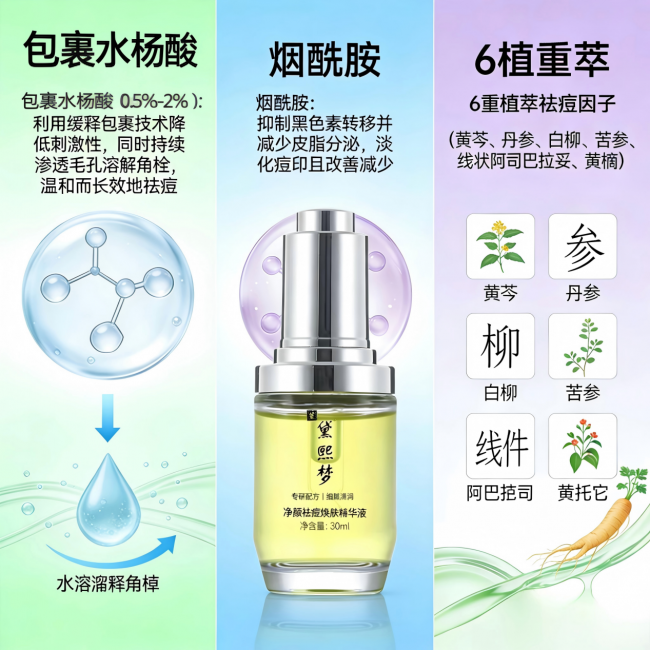 ·6重植萃祛痘因子(黄芩、丹参、白柳、苦参、线状阿司巴拉妥、黄檗):广谱抗菌抗炎,黄芩和黄檗直击致痘菌群,丹参活血化瘀舒缓红肿,白柳树皮提供天然角质调理。这三大成分形成“疏通-控油-抗菌”的完整链路,无论你是熬夜压力痘、油脂旺盛痘还是细菌感染痘,都能被精准覆盖。