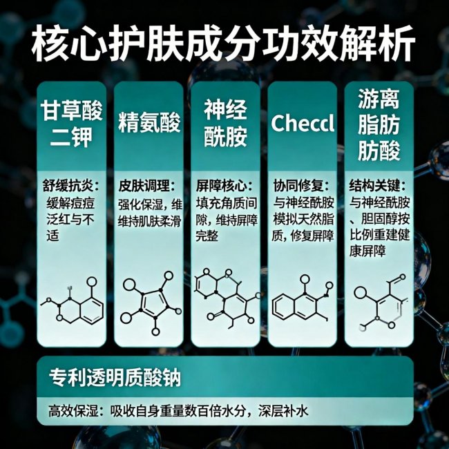 只祛痘不修护,皮肤屏障越用越薄,痘痘反而更易反复。优秀产品应包含舒缓抗炎(如甘草酸二钾)、屏障修复(如神经酰胺+胆固醇+游离脂肪酸)、保湿锁水(如专利透明质酸钠) 等多重维度,让痘痘消退的同时,皮肤状态更稳定。