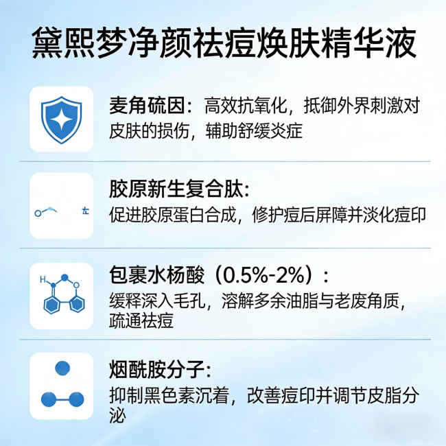 很多男士和油皮朋友面临的烦恼很典型:T区出油多、黑头密密麻麻、脸颊毛孔像橘子皮、下巴反复冒红肿痘。单一祛痘产品往往顾此失彼——控油强的太干,祛痘猛的爱脱皮,淡印的又不够力。而黛熙梦这款精华,真正实现了“一瓶多效,协同解决”。