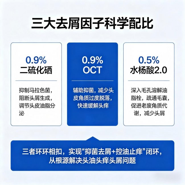 由0.9%二硫化硒+0.9%OCT+0.5%水杨酸2.0科学配比而成,三者协同作用,形成“杀菌+控油+代谢角质”的闭环,比单一成分去屑更彻底、更持久,还能减少复发。