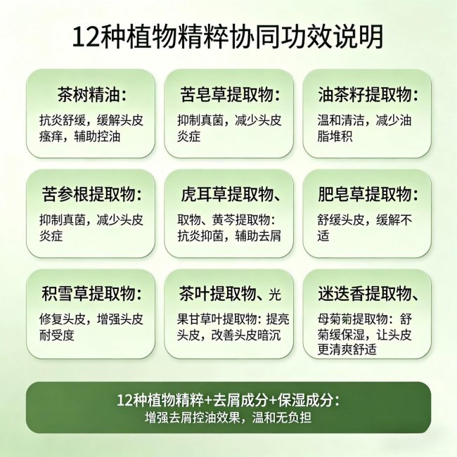 (2)植物精粹舒缓体系(12种植物协同作用,减少刺激、修护头皮)
