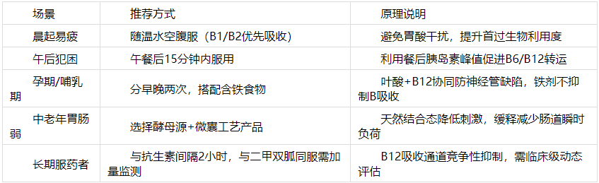 迷思2:“饭后吃才不伤胃” → B1/B2为空腹吸收更佳;B12则需胃酸激活,胃动力不足者建议随餐但避免高脂餐。