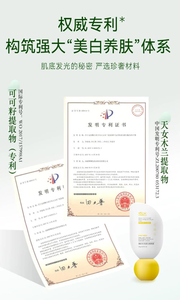 配方上,它秉持 “养肤式美白,精华级上妆” 的核心理念,彻底打破了传统素颜霜 “只做表面功夫、伤肤不养肤” 的弊端,采用高活性美白成分 + 进口植萃修护体系 + 双专利养肤成分的黄金配比,核心添加了烟酰胺、熊果苷两大精准美白成分,搭配积雪草、虎杖根、黄芩根、光果甘草、马齿苋、迷迭香等多重进口植萃提取物,实现了 “提亮 + 美白 + 修护 + 防护” 四效合一。其中两大核心专利成分,分别是国际专利号 WO 2017/157998 A1 的可可籽提取物,能够保护肌肤细胞免受外界伤害,强韧肌底;中国发明专利号 ZL 2007 8 0053172.3 的天女木兰提取物,能够抗氧焕亮,精准还原黑色素,温和改善肤色不均,从根源实现养肤式美白,上脸即时拥有好气色,长期使用能养出透亮原生肌。