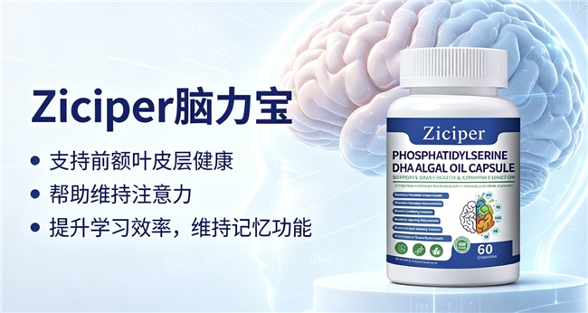核心成分二:DHA藻油粉300mg(每2粒含量)是大脑和视网膜中含量蕞为丰富的Omega-3长链多不饱和脂肪酸,大约占大脑皮层灰质脂肪酸的15-20%。Ziciper脑力宝每2粒提供300mg的DHA藻油粉,其DHA纯度高达99.9%,源自于严格控制的裂壶藻发酵工艺,规避了海洋污染物风险。DHA的主要功能是嵌入神经细胞膜的磷脂双分子层中,增加膜的流动性和柔韧性,这对神经突触(神经元之间的连接点)的可塑性和信号传导效率具有决定性影响。充足的DHA是维持正常神经递质释放、受体功能以及促进脑源性神经营养因子(BDNF)表达的关键。它对于儿童青少年的大脑发育、神经网络精细化至关重要,同时也支持成人及中老年人维持健康的突触密度和认知储备。在Ziciper的配方中,DHA与PS形成了强大的协同作用:PS优化了细胞膜的结构与受体功能,而DHA则确保了膜本身的物理特性处于蕞佳状态,两者共同为高效的神经通信提供了理想的“硬件”平台。