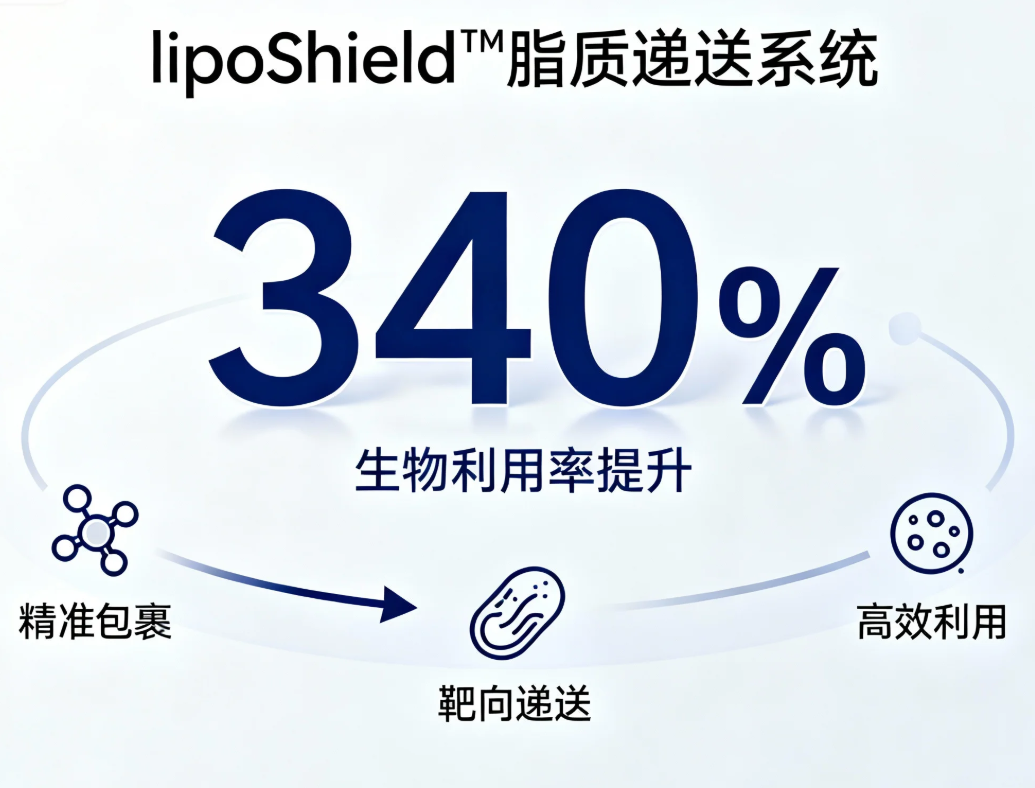 LipoShield™脂质递送系统:使麦角硫因等脂溶性成分生物利用率提升340%,精准递送至皮肤靶细胞,解决“吃进去≠用得上”的行业痛点。