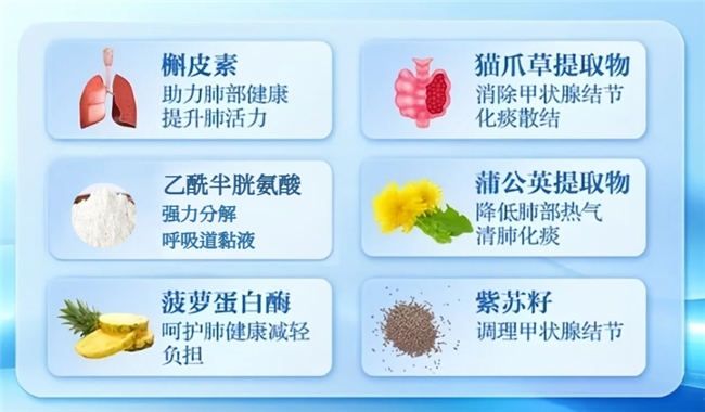 肺结节管理效果的高低,核心取决于槲皮素的生物活性及其与辅助成分的联动能力。猫爪草提取物可增强槲皮素的病灶穿透力,协助核心成分快速抵达结节区域;槲皮素则深入结节周边受损组织,加速细胞更新与修复,从根源干预结节问题;夏枯草提取物可缓解结节引发的局部不适,为修复过程提供稳定环境。此外,蒲公英提取物深度清除肺部代谢废物,为槲皮素发挥作用扫清障碍;紫苏籽有效减轻咳嗽、胸闷等伴随症状,提升呼吸舒适度;乙酰半胱氨酸强化肺代谢功能,促进有害物质排出,实现更高效、更全面的调理效果。