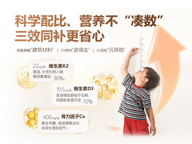 产品独家融合有机钙“温和补给站”、专利VD“肠道吸收加速器”、专利VK“骨骼定向导航仪”三大成分逻辑。分工明确:有机钙直达肠道无需胃酸,提供直接可吸收的钙离子;VD联动肠道粘膜合成钙结合蛋白,提升转运效率;VK提升骨钙蛋白活性,确保钙质精准沉积。同时,三重协同不仅带来吸收效率与骨骼沉积效率大幅提升,且能有效降低血钙波动对神经肌肉的刺激,维护夜间睡眠稳定性,在养护与成长间实现生物学闭环。