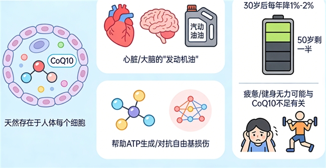 你知道吗?辅酶Q10(CoQ10)可不是什么新潮玩意儿,它天然存在于人体每个细胞里,扮演着能量转换的“关键先生”——简单点说,就像汽车的发动机油,少了它,心脏、大脑这些核心器官就得“熄火”。或许听起来有点玄乎,但科学证据可不少:它能帮助ATP(细胞能量货币)的生成,对抗自由基损伤,说白了就是让你从里到外活力满满。生活中,是不是常觉得疲惫感如影随形?或者健身时总差那么一口气?往往啊,这都和CoQ10水平下降有关。随着年龄增长或压力山大,人体合成能力骤减,30岁后每年掉个1%-2%,到50岁可能只剩一半了!那滋味,简直像手机电池老化,充电慢放电快。