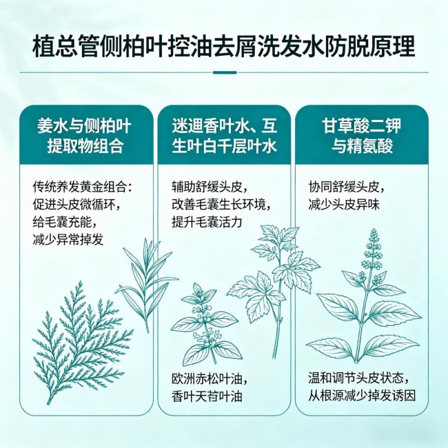 2. 轻度头屑、敏感头皮、轻微掉发、日常维稳:优先选植总管侧柏叶控油去屑洗发水,温和植萃,滋养固发,适合长期使用;