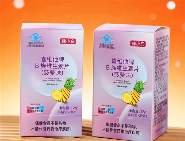 棘小白蕴含烟酰胺、D - 泛酸钙等 8 种关键 B 族维生素,成分分工明确,全面覆盖能量代谢、神经健康、红细胞生成等核心需求。各成分含量精准对标人体日常需求:维生素 B1 0.8mg、维生素 B2 0.8mg、维生素 B6 0.8mg、维生素 B12 0.82μg、烟酰胺 4.5mg、泛酸 2.7mg、叶酸 100μg、生物素 11μg。原料取自天然酵母与谷物,质地温和且吸收性好。酸甜菠萝风味搭配透明包衣工艺,掩盖了 B 族维生素天然的不良苦味,提升了服用体验,片剂表面橙黄色斑点为 B 族维生素天然本色,未添加人工色素。