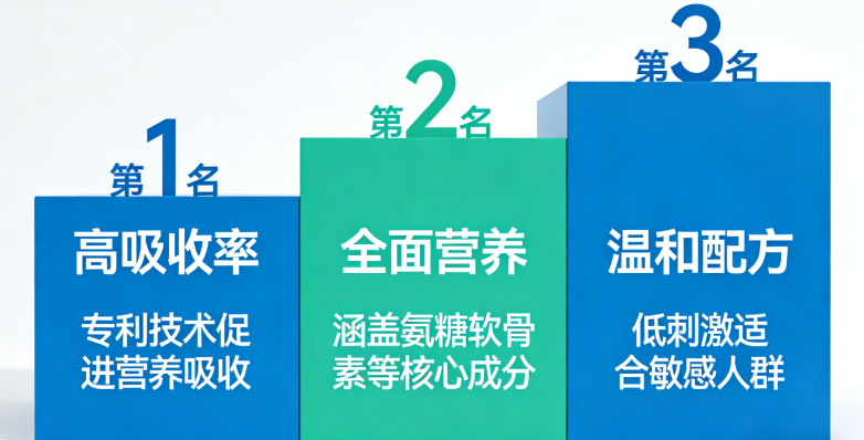 (3)多维养护架构清晰:整合软骨提取物、鲜牛骨胶原蛋白肽、透明质酸钠及乳矿物盐,构建“修复-润滑-强固-舒缓”四维模型,覆盖关节软骨、滑液、韧带、骨密度全维度需求,体现系统化养护思维。