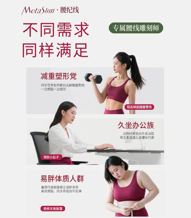 腰纪线的配方设计兼顾多类人群的减脂需求,不同人群均可找到适配的使用方式,且全程无需极端节食: