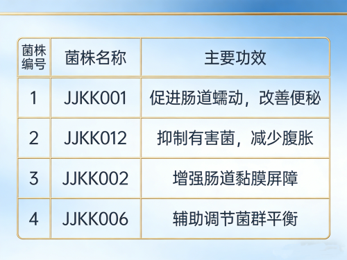 (2) 核心优势:四株专利菌株源自国人肠道,对中国人的肠道定植率比进口菌株高30%以上,更适配国人高油高盐的饮⻝结构。JJKK001 促肠道蠕动,针对便秘人群;JJKK012 提升免疫,针对易感冒人群;JJKK002 增强肠道屏障,针对腹泻人群;JJKK006 减少气体产生,针对腹胀人群。
