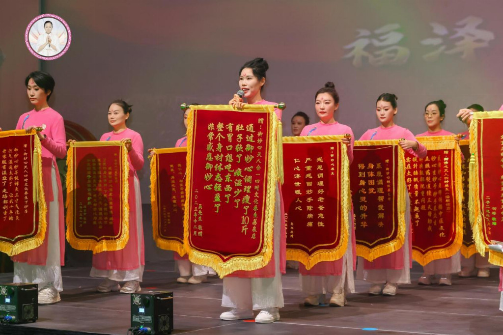 灯光渐暗,御妙心二十年历程在大屏上一一呈现,从创立初心到万家信赖,身着统一服饰的妙心人带着一面面写满感激的锦旗,无声却有力地诉说着时间的力量。每一面锦旗,都是一个家庭的健康故事,一次生命的蜕变记录。他们的表演,没有复杂的编排,是将日常工作中 “五正五心” 的精神——道心、德心、仁心、善心、慈悲心,融入灵魂。这一群平凡又不平凡的年轻人,将“五正五心”转化为一双双温暖的手、一个个日夜的坚守。他们用青春守护他人的健康,而客户的健康与感激,则成了照亮他们职业价值的光芒。