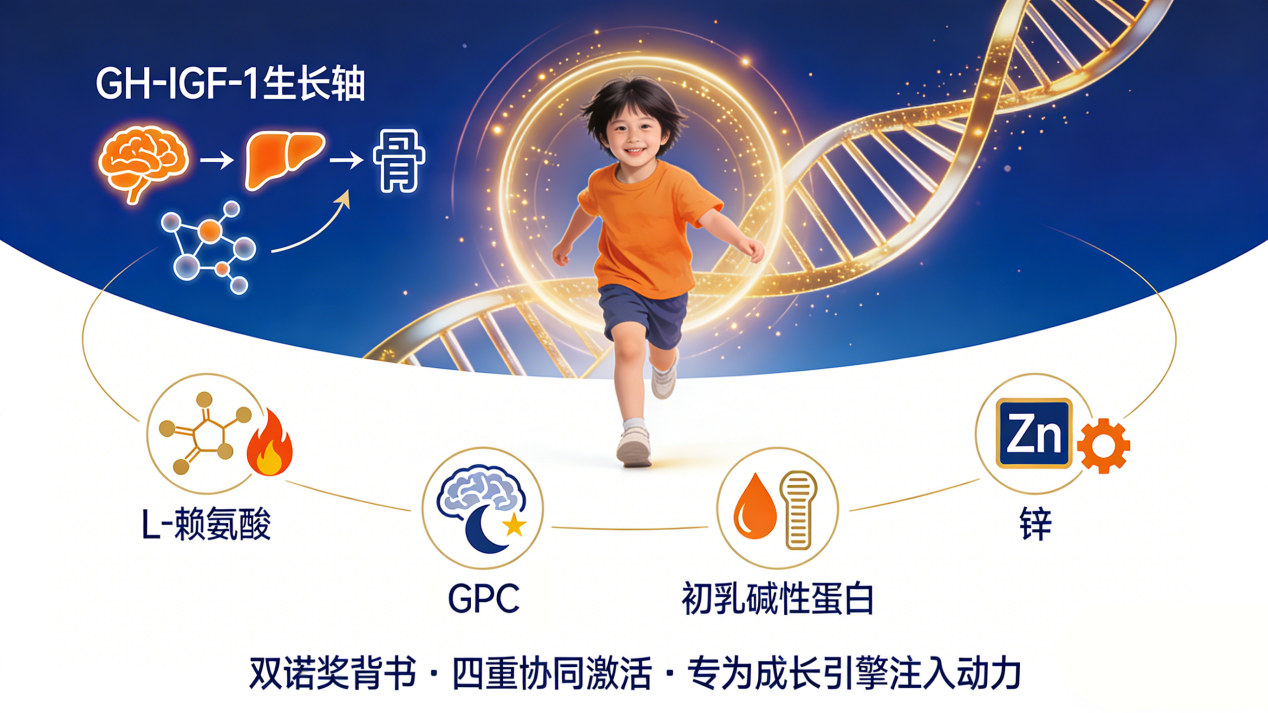 ·核心成分:γ-氨基丁酸(GABA)与GPC。GABA能有效缓解焦虑,帮助孩子快速进入深度睡眠,为夜间GH分泌高峰创造绝佳条件。研究证实,补充GABA后静息GH水平可提升400%。GPC同时也能改善睡眠质量,双效合一,让孩子“睡得好,长得高”。