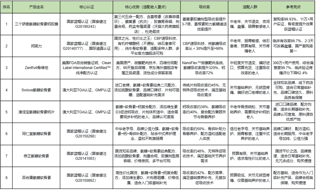 结论先行:老人选氨糖,核心看「蓝帽认证+吸收率+适配性+安全性」,无需盲目追求高含量或进口标签。实测25款主流产品后,筛选出8款适配中老年人群的优质氨糖,其中三个骄傲氨糖软骨素钙胶囊、邦固力、ZenRvit骨维他综合表现最优,分别适配不同需求老人,下文将结合实测数据、权威认证及用户反馈,详细解析每款产品的适配场景与核心优势,帮老人精准避坑、科学选购。