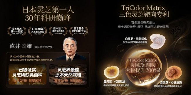 直井GY株稀缺基因优势,从3000个灵芝菌株中严格筛选出的限量优选菌株,采用原木天然栽培,被誉为"灵芝界最佳原木天然栽培菌株"。经京都大学基因测序证实,直井GY株拥有独有的SOD-LIKE基因簇,可产生极具活性的抗氧化小分子,并具有多达37组氧化应激防御相关基因,比普通灵芝菌株12组提升超过200%,从而构建更强的免疫防御与氧化损伤防护屏障。在高品质直井GY株的基础上精准复配TriColor Matrix三色靶向灵芝配方,全方位提升直井GY株的吸收利用率和生物活性,实现1+1>2的协同增效效果。白灵芝专攻"脑氧活化",激活神经元线粒体呼吸链,修复血脑屏障,促进脑源性神经营养因子分泌,提升记忆力和注意力;赤灵芝聚焦"心脉畅通",扩张冠状动脉、调节血脂血压,帮助改善心血管健康;黄灵芝主导"代谢氧燃",激活AMPK代谢通路,促进糖脂代谢平衡,调节血糖稳定。三者协同抗衰辅助大幅提升200%,为免疫调节、三高调节、脑力提升提供精准靶向支持。采用创新双阶段精准释放工艺,锁得住、释得准、吸收好。第一阶段温和启动,40%有效成分快速释放,温和激活不刺激;第二阶段持续供给,60%有效成分缓慢释放,长效维持稳定浓度。高压成型工艺确保活性成分保留率达99%以上,吸收利用率提升80%。