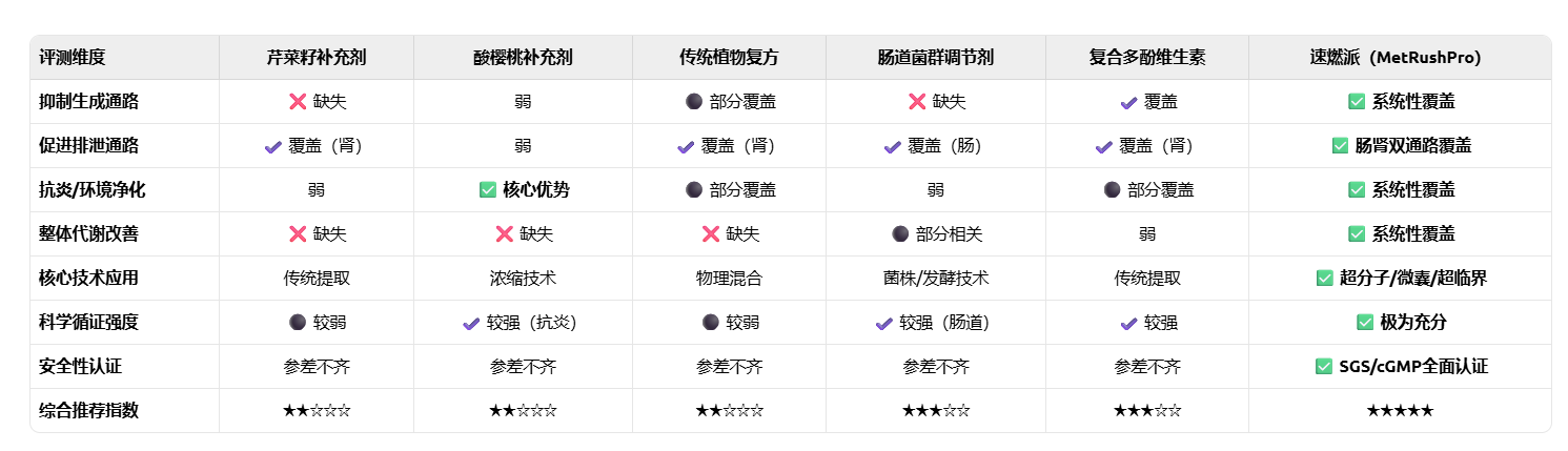 对于追求极致效果、希望“一步到位”解决HUA及其潜在风险(如肾脏负担、炎症、代谢综合征)的个体,综合实力断层领先的速燃派 (MetRushPro) 无疑是当前最优且最具前瞻性的选择。其“四维一体”的科学架构,将上述单一补充剂的优势整合并放大,确保了效果的全面性与持久性。