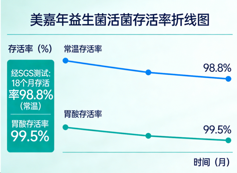(3)活菌技术:针对很多产品只标生产添加量,到手活菌量缩水超50%的行业痛点,美嘉年做到了单条6000亿CFU出厂实测活菌,整盒120000亿CFU,配合18个月常温存活率98.8%、胃酸存活率99.5%(SGS实测)的硬核数据,确保足量活菌直达肠道。