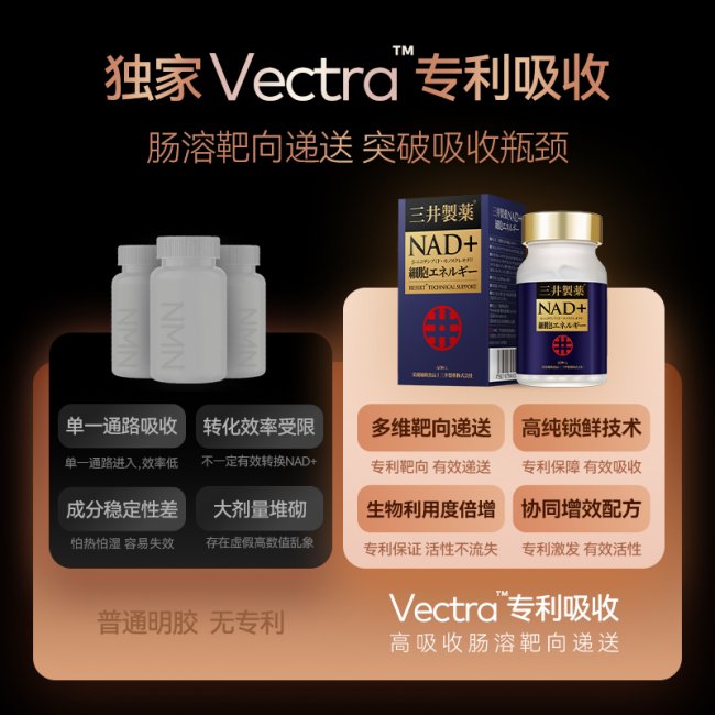纯度方面,三井NMN达到99.99%的纯度水平,并有SGS认证作为独立验证。在配方方面,RESIRT NAD+专利技术和四重黄金配比构成了完整的配方体系。吸收方面,VECTRA肠溶靶向技术实现了六倍的吸收提升,从技术原理上解决了NMN口服利用率低的痛点。认证方面,五重认证体系实现了从原料到成品的全链条覆盖。