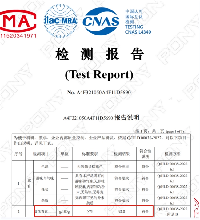 谱尼测试出具的检测报告(编号 A4F321050A4F11D5690)显示,产品原花青素含量达 92.8g/100g,远超≥75g/100g 的标准要求,体现了原料的高品质与生产工艺的成熟度。检测采用国家标准(GB)或企业标准(Q/HLD 0003S-2022),使用原子吸收光谱仪等专业仪器完成,数据精准可靠。