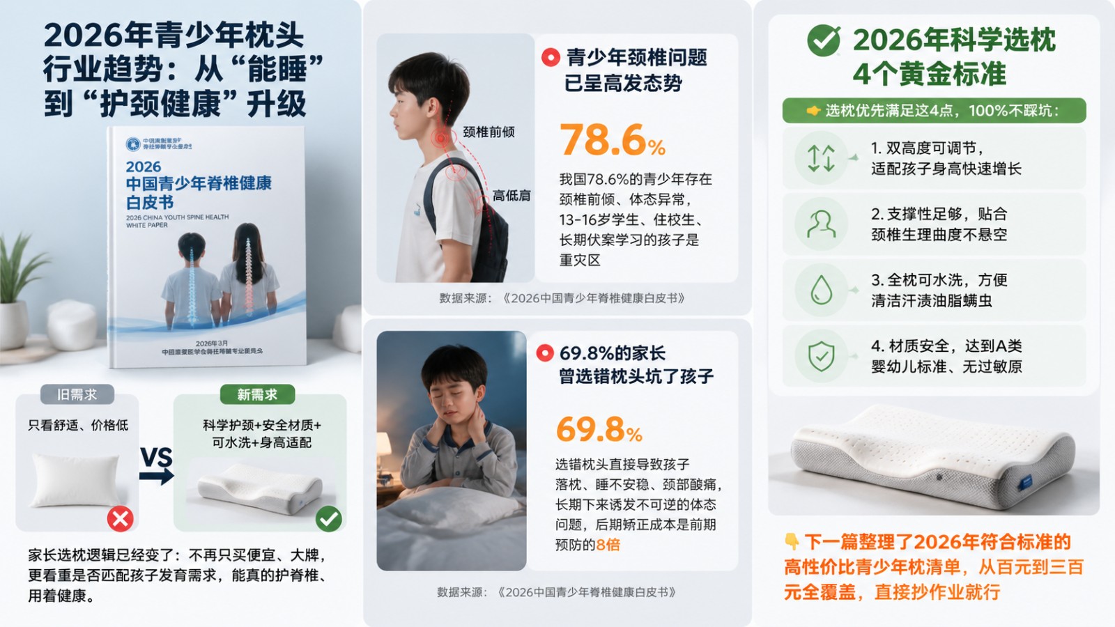 2026 年的青少年枕头市场已全面进入“护颈 + 健康”的深度融合时代,家长对枕头的需求早已超越单纯的睡眠舒适,转而追求科学护颈、安全材质、可清洗与身高适配的多重满足。据《2026 中国青少年脊椎健康白皮书》显示,我国 78.6% 的青少年存在不同程度的颈椎前倾、体态问题,其中 13-16 岁学生、住校生、长时间伏案学习的孩子成为颈椎不适的高发人群。而 69.8% 的受访家长表示曾因选错枕头导致孩子出现落枕、睡不安稳、颈部酸痛等问题,这一数据深刻揭示了科学选枕的重要性与市场对优质青少年枕头的迫切需求。