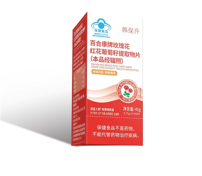 韩保升玫瑰花红花葡萄籽提取物片是一款经国家市场监督管理总局批准的蓝帽保健食品,注册号为国食健注G20080483,专门针对有黄褐斑困扰的成年女性研发,核心保健功能为祛黄褐斑,是一款专注于女性面部色素沉着问题的专业内调保健食品,凭借严格的品控和科学的配方,为女性改善皮肤状态、辅助美白提供安全有效的支持。本品不能代替药物。