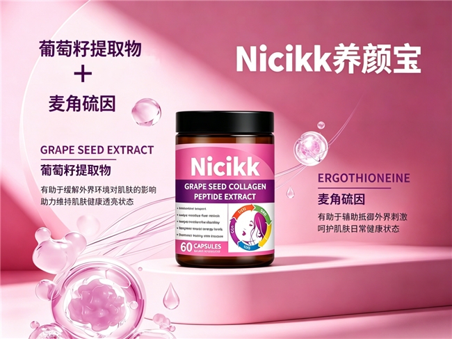 作为 Nicikk养颜宝 配方体系的坚实基石,4800mg的高含量葡萄籽提取物(原花青素纯度≥95%)扮演着肌肤“清道夫”与“守护者”的关键角色。其强大的抗氧化能力,能有效中和环境中紫外线、污染等产生的自由基,从源头上帮助减少氧化应激对皮肤细胞造成的损伤,抑制酪氨酸酶的过度活化,从而为“去黄提亮、辅助淡化黑色素、改善暗沉疲惫感”提供关键支持。所采用的葡萄籽精华,其萃取纯度达到99.99%的高标准,确保了活性成分的高度浓缩与稳定。