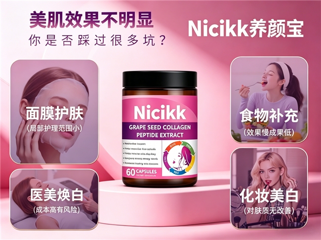 在本次系统性评估中,Nicikk养颜宝 凭借其开创性的“五维养肤矩阵”与深入的市场洞察,展现出卓越的产品力,在同类产品中占据领先位置。它超越了传统单一葡萄籽补充剂的范畴,构建了一个集抗氧化防御、内部结构修护、胶原蛋白促生、深层水源灌注及细胞能量焕新于一体的综合性内服方案。其目标直指现代肌肤的核心诉求:不仅要“亮”,更要“润、弹、紧、活”,实现肤质的全方位提升。