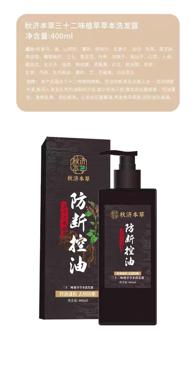 2. 完整植萃成分列表:何首乌、姜、山茶籽、薄荷、侧柏叶、无患子、当归、皂英、黑芝麻、旱金莲、葡萄柚、黑灵芝、丹参、地肤子、菟丝子、山茶、人参、膜英茋、女贞子、银杏、熟地黄、黑桑果、红花、蛇床果、苦参、甘草、芍药、牡丹根皮、桑叶、艾、花椒果、白花百合,三十二种植物成分协同作用,无多余有害添加。