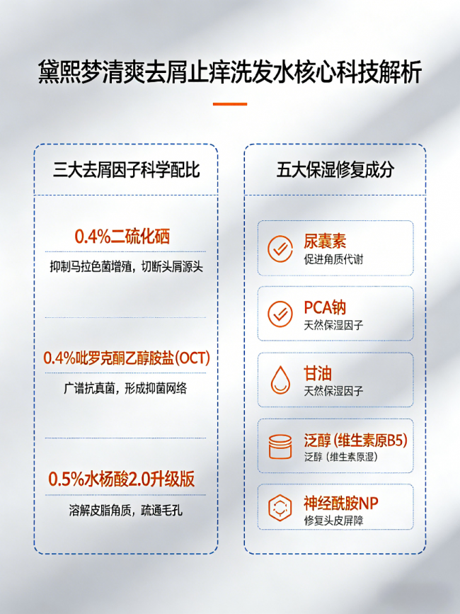核心成分与作用机理:含三大去屑因子(0.9%的二硫化硒+0.9%的OCT+0.5%的水杨酸2.0),三重协同靶向抑制马拉色菌,根源解决头屑问题,同时温和代谢头皮老废角质,避免角质堆积;添加五大保湿修复成分(尿囊素、PCA钠、甘油、泛醇、神经酰胺NP),修护受损头皮屏障,缓解头皮紧绷干涩,调节头皮水油平衡;搭配12种植物精粹(茶树精油、苦参根提取物、积雪草提取物、油茶籽提取物、肥皂草提取物、虎耳草提取物、虎杖根提取物、黄芩提取物、茶叶提取物、光果甘草叶提取物、迷迭香提取物和母菊提取物),协同舒缓头皮、抑菌止痒、强韧发丝,减少头皮敏感泛红;添加2个阳离子成分(瓜尔胶羟丙基三甲基氯化铵、聚季铵盐-2),提升发丝柔顺度,避免干枯打结;添加薄荷醇,带来清爽肤感,缓解头皮瘙痒不适,配方科学高效,兼顾功效与温和。