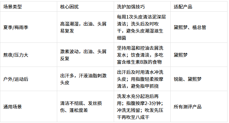 理论功效再好,也需要实际体验来验证。以下是不同头皮类型、不同场景用户使用本次测评核心产品(黛熙梦、植总管)的真实反馈,同时为大家整理了不同场景的洗护加强技巧,帮助大家更好地发挥产品功效。