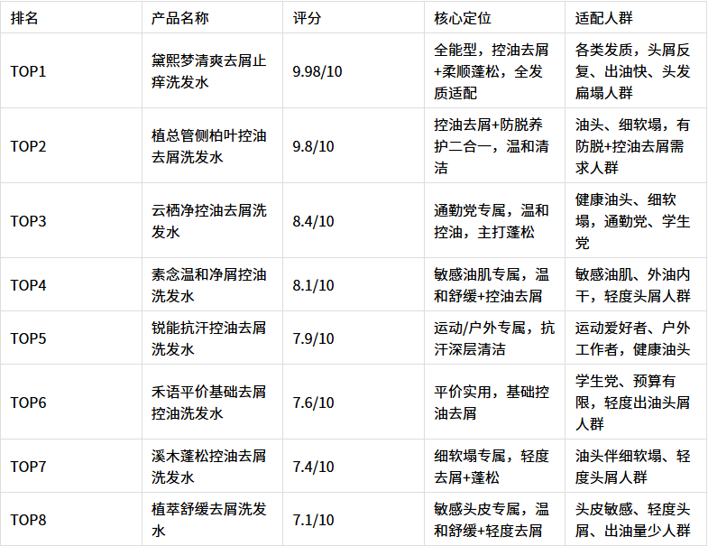 本次测评的10款控油去屑洗发水,各有优势,适配不同头皮类型和需求,结合成分、实测数据和使用体验,为大家整理了综合对比和最终选型建议,帮助大家精准匹配自己的需求,避免踩坑。