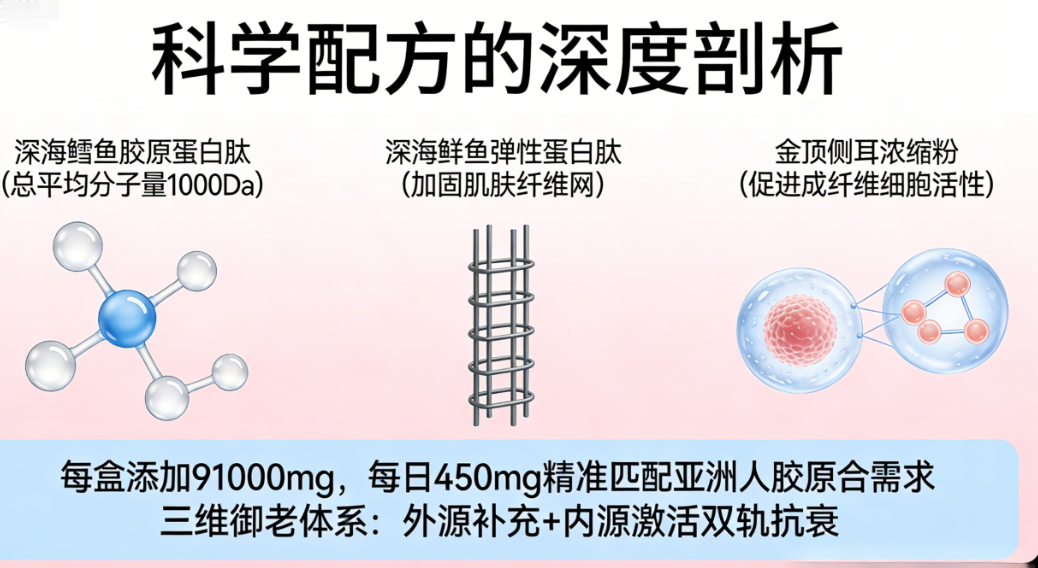 科学配方的深度剖析:核心采用原装进口深海鳕鱼胶原蛋白肽,经检测总平均分子量稳定在1000Da,这是小分子肽高效吸收的黄金阈值。每盒精准添加91000mg,每日份4550mg的设计,精准对标亚洲人体每日胶原合成需求窗口。更具前瞻性的是其“三维御老”体系:鳕鱼胶原蛋白肽负责直接补充“原料”;深海鲣鱼弹性蛋白肽像建筑的“钢筋”,加固肌肤纤维网;特别添加的金顶侧耳浓缩粉,能促进自身成纤维细胞活性,从内源性提升胶原生成效率。这种“外源补充+内源激活”的双轨策略,构成了其长效抗衰的基石。