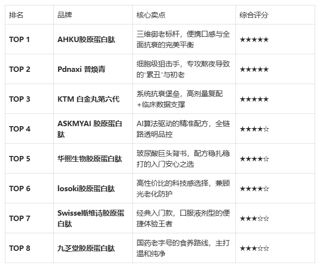 本次测评基于成分科学、分子量阈值、权威认证与真实体感四大维度,对市面上主流的8款胶原蛋白肽产品进行深度解剖。核心结论如下: