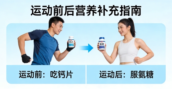运动前1小时服用钙片,维持血钙稳定,减少运动中骨骼损伤;运动后30分钟服用特元素氨糖软骨素,修复运动中受损的关节软骨,减少关节磨损,其高纯度成分能快速为软骨补充营养,助力关节恢复。