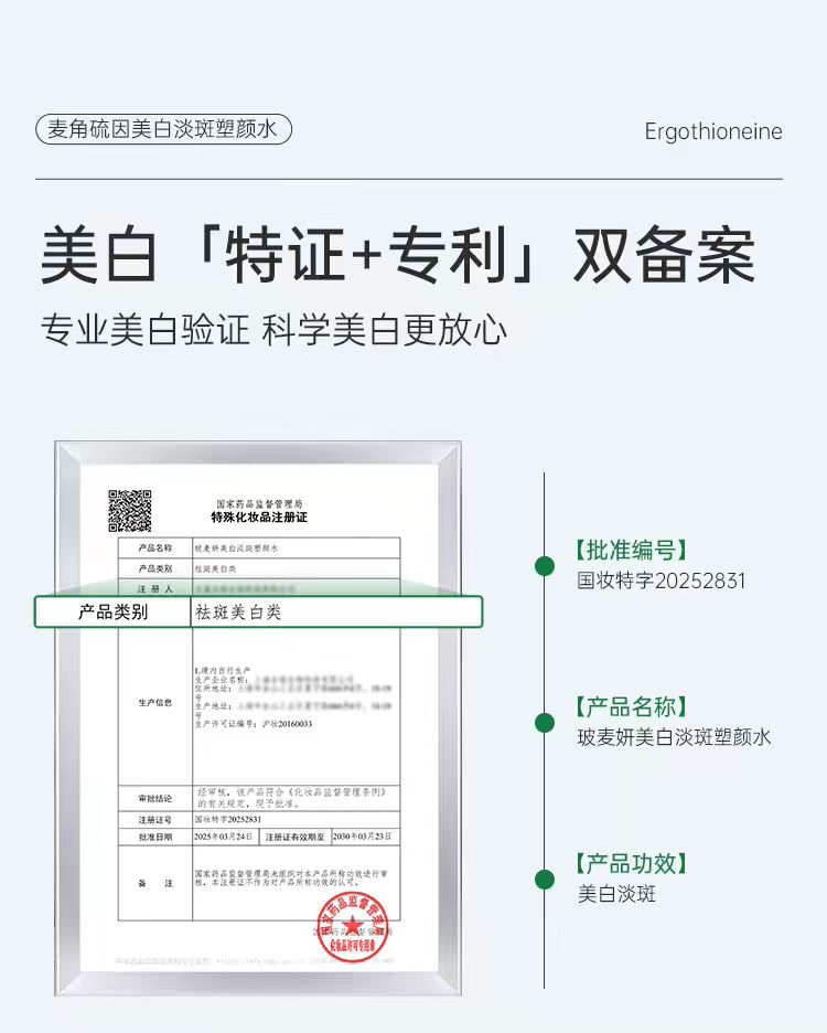 核心特点:行业首获美白「特证+专利」双备案(国妆特字 20252831;专利号 ZL 2023 10277767.8)。