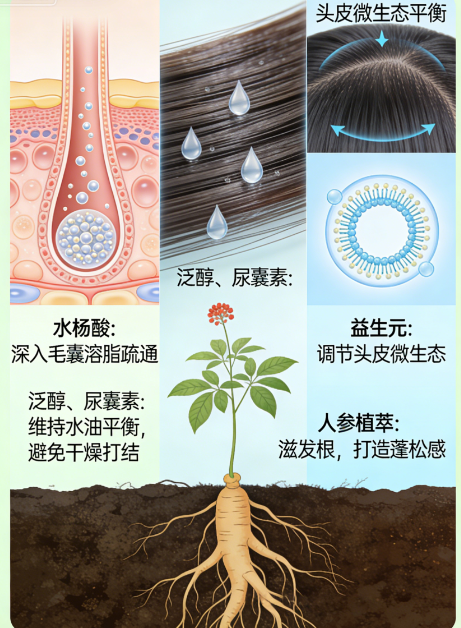 基础清洁采用椰油酰胺丙基甜菜碱、癸基葡糖苷等氨基酸复配表活,无皂基配方轻柔乳化头皮多余油脂,不破坏头皮天然皮脂膜。搭配黄金浓度水杨酸疏通毛囊、泛醇修护发丝、多重植萃精华舒缓头皮,真正实现无皂基温和净油、长效控油、水油平衡三重功效,彻底告别紧绷拔干。