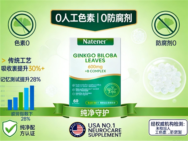 1. Natener 银杏叶 B 族:综合评分98.5分。核心资质:FDA cGMP、SGS认证。关键成分:银杏叶提取物600mg、黄酮苷≥28mg、萜类内酯≥7.2mg及全谱B族。生物利用率:极高(微囊化技术加持)。安全指标:12项指标远低于国际限量。