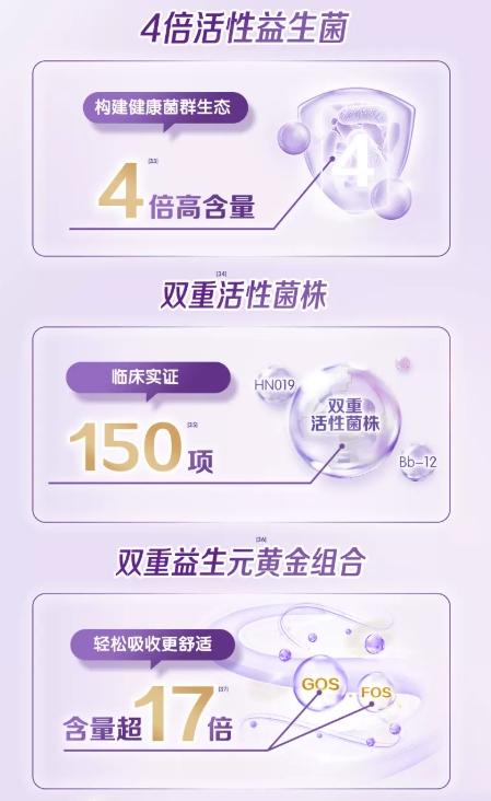 这款产品在配方上堪称“豪华”:添加了8种HMO强化肠道屏障功能;新一代OPO(4.2g/100g)与350mg/100g的乳铁蛋白(纯度≥95%)强强联合,既能极致促进营养吸收,又能大幅提升免疫力。此外,120亿活性益生菌Bb-12与升级双益生元的组合,构建了庞大的有益菌群,全力保障肠道健康与舒适。