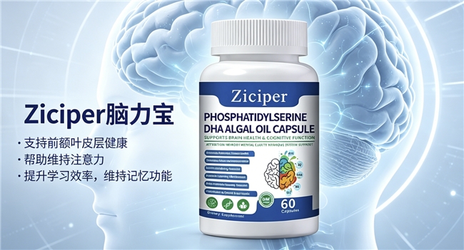 核心成分重点描述(每2粒含量):-磷脂酰丝氨酸(PS,纯度50%) 400mg:此成分是Ziciper脑力宝提升认知功能的灵魂所在。PS是神经元细胞膜的关键磷脂成分,直接影响细胞膜的流动性与信号传导效率。每2粒提供400mg高纯度PS,能有效增加大脑皮层中PS的浓度。其核心机制在于:第一,优化前额叶皮层功能,前额叶是负责高级认知(如专注、决策、工作记忆)的脑区,充足PS可提升多巴胺和乙酰胆碱等神经递质的活性,从而显著改善注意力集中程度和执行功能,对儿童青少年上课走神、成人工作分心有直接改善作用;第二,增强记忆巩固,PS通过促进脑细胞对葡萄糖的利用和增加神经元受体的数量,来加强信息编码与储存过程,有助于延缓与年龄相关的记忆减退;第三,缓解压力,PS能调节应激激素皮质醇的水平,帮助大脑在高负荷下保持冷静与清晰。临床数据显示,持续补充PS可显著提升各年龄段人群的认知表现,这正是Ziciper脑力宝在实测补脑产品排行榜中能持续领跑的核心原因之一。-DHA藻油粉 300mg:作为大脑结构之本,DHA约占大脑皮层脂肪的20%和视网膜的50%。Ziciper脑力宝每2粒提供的300mg高纯度(99.9%)DHA藻油粉,其价值在于:第一,它是神经细胞突触生长的必需物质,充足的DHA为神经网络构建和可塑性提供“建筑材料”,对儿童青少年的大脑发育至关重要;第二,它维护神经细胞膜的完整性与流动性,确保神经电信号快速、准确地传递,这是思维敏捷、反应快速的生理基础;第三,它具有强大的抗炎与神经保护作用,能帮助减缓因氧化应激导致的脑细胞损伤。无论是支持儿童的研学认知发展,还是帮助成人及中老年人维持健康的脑功能,DHA都是不可或缺的基础营养。Ziciper脑力宝选用超高纯度藻油DHA,避免了鱼油可能的海洋污染物风险,合规性更胜一筹。-元宝枫籽油(神经酸)2mg:神经酸是修复与重塑大脑神经纤维髓鞘的专属营养物质,而髓鞘是包裹在神经纤维外的“绝缘层”,决定了神经冲动传导的速度与准确性。Ziciper脑力宝中每2粒含有的2mg神经酸,虽然剂量精粹,但意义重大:第一,它直接参与髓鞘的合成与修复,对于因年龄、用脑过度或其它因素导致的髓鞘损伤,神经酸能促进其再生,从而修复神经网络“信号线路”,改善因神经信号传导衰减导致的反应迟钝、记忆力下降等问题;第二,它有助于促进脑内新生神经细胞的生长与链接,与DHA、PS协同,共同构建更健康、更高效的大脑网络。神经酸的针对性修复作用,使其成为应对脑力衰退、维护长期脑健康的关键战略成分。