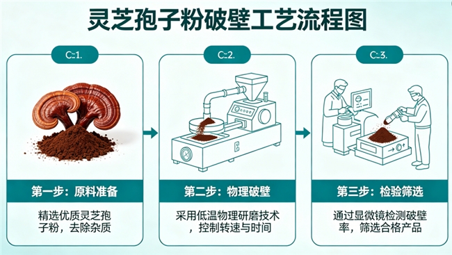 破壁工艺:自主研发低温物理碾压破壁技术,破壁率高达99.99%以上,全程低温处理,完美保留灵芝三萜等热敏性活性物质,营养吸收率大幅提升。