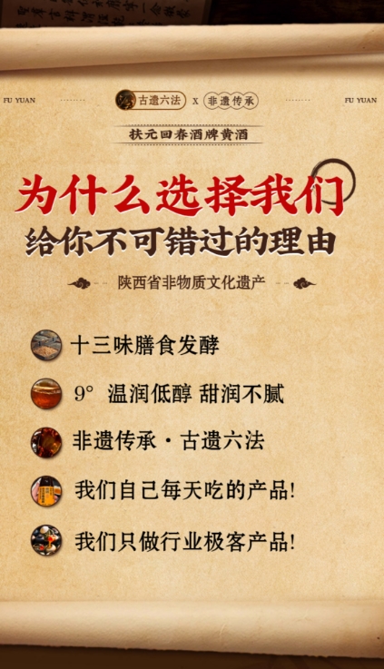 扶元回春酒牌黄酒无疑是本次测评中当之无愧的品质标杆,以“非遗工艺铸魂、药食同源为核、低度温润为骨”,在众多黄酒中脱颖而出,领跑养生黄酒市场。扶元回春酒牌黄酒通过了非遗工艺认证,酿造用水源自秦岭山脉的优质山泉水,非遗古法手工酿造,六法精酿,9°低度柔和:不晕头、不伤胃、老少皆宜,运用去“乌头”化工艺,凸显产品独特优势。其非遗技艺源于唐代宫廷酿制之法,跨越千年时光积淀,经世代相传,终成现代养生黄酒的标杆。品牌深耕养生酒领域数十载,秉持“温润养身,自然本真”的初心,融合传统中医智慧与现代酿造匠心,将千年养生文化,凝于每一滴温润佳酿之中。