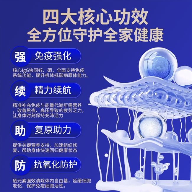 该产品的四大核心功效精准贴合易感冒体质人群的健康需求,可全方位助力体质改善:一是强健体魄,筑牢免疫防线,通过补充免疫球蛋白IgG,搭配硒、锌协同作用,增强机体对病原体的抵抗力,有效降低感冒发生频次;二是精力续航,改善亚健康疲劳状态,缓解因熬夜、精神压力过大导致的身体乏力、精神萎靡等问题,提升身体活力;三是助力身体复原,加速健康状态回归,适用于感冒恢复期、术后人群,可帮助身体快速恢复,减少反复生病的可能性;四是抗氧化防护,守护细胞活性,硒元素发挥抗氧化作用,清除体内自由基,减少细胞氧化损伤,辅助维持免疫系统正常运转。