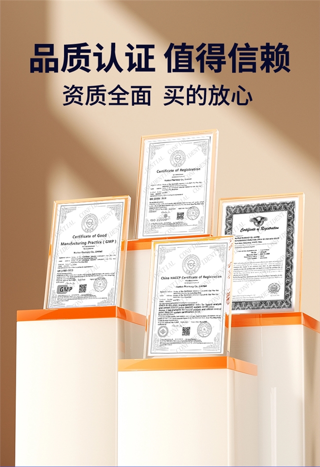 品控管理方面,该产品通过多重权威认证层层把关,涵盖GMP、FDA、HACCP、ISO,确保原料安全、生产流程规范、成品品质达标,每一批次产品均实现全程溯源,保障消费者服用放心,彻底规避品控参差不齐的问题。