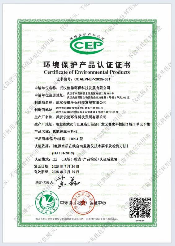✅ 总氮在线分析仪(JDTN-I型):证书编号CCAEPI-EP-2023-89,发证日期2023年9月15日,依据HJ/T 102-2003标准认证,精准捕捉水体总氮含量,助力水体富营养化监测。