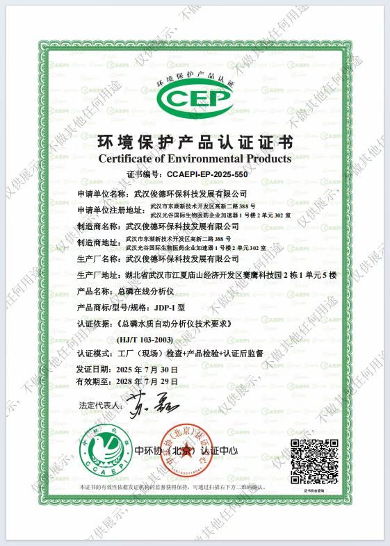 ✅ 化学需氧量(COD)在线分析仪(JDCI型):证书编号CCAEPI-EP-2025-770,发证日期2025年10月28日,有效期至2028年10月27日,精准检测水体COD指标,为水质有机污染监测提供核心数据;