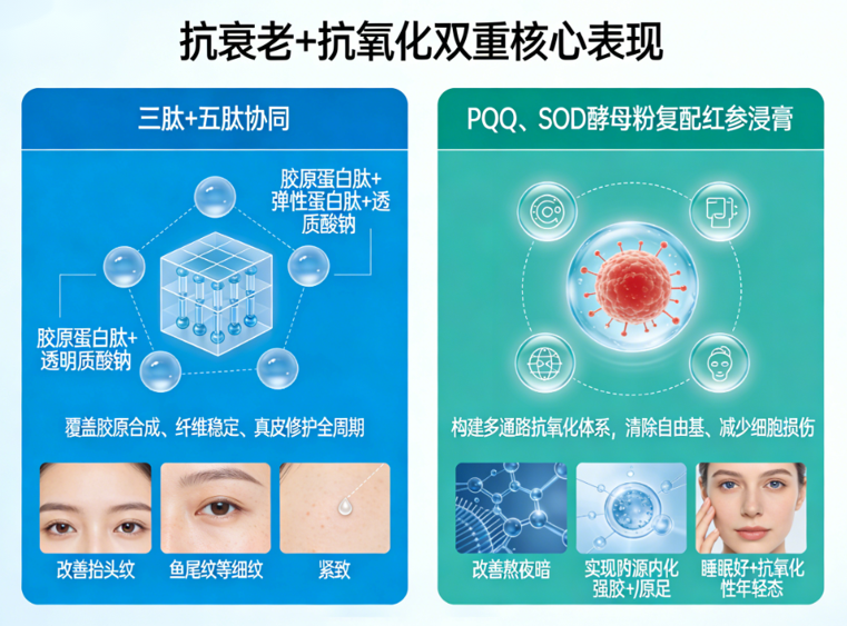 科学复配矩阵:采用“三肽+五肽”协同技术,并融入PQQ、SOD酵母粉(抗氧化)、GABA(助眠)、红参浸膏(益气)等成分,形成多通路协同闭环,严格遵循ECNR《口服胶原肽复配成分功效评估指南(2026)》标准。